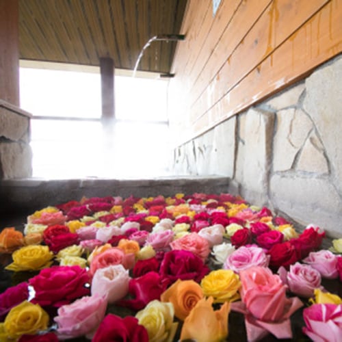 露天風呂に併設されたバラ風呂には、農家より仕入れた身体に優しいバラを使っています。